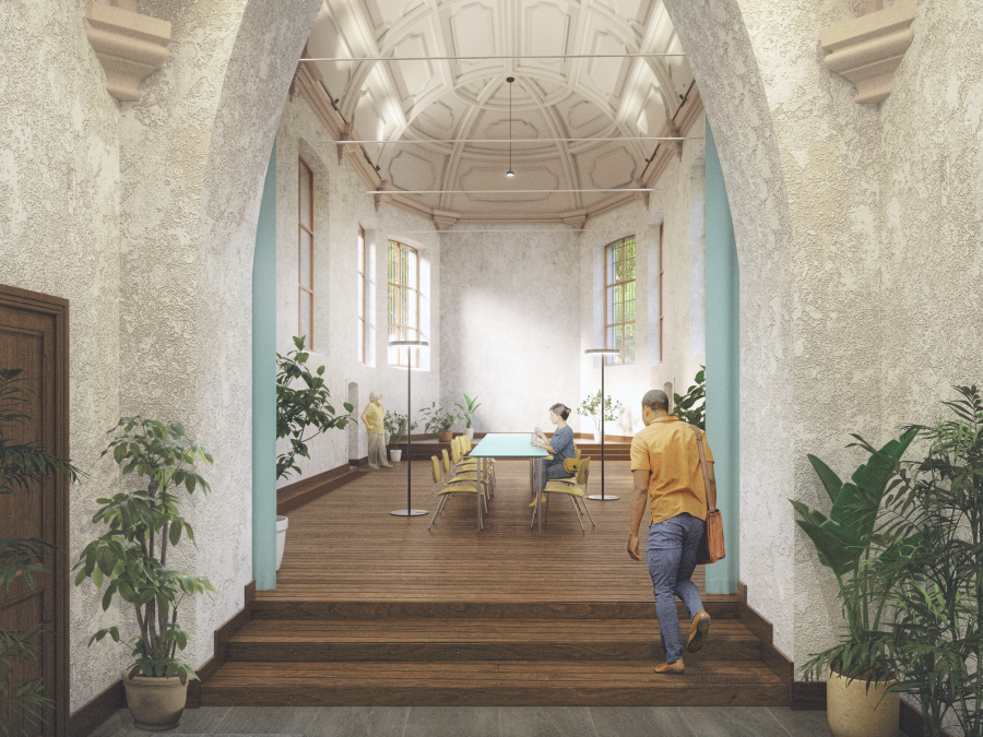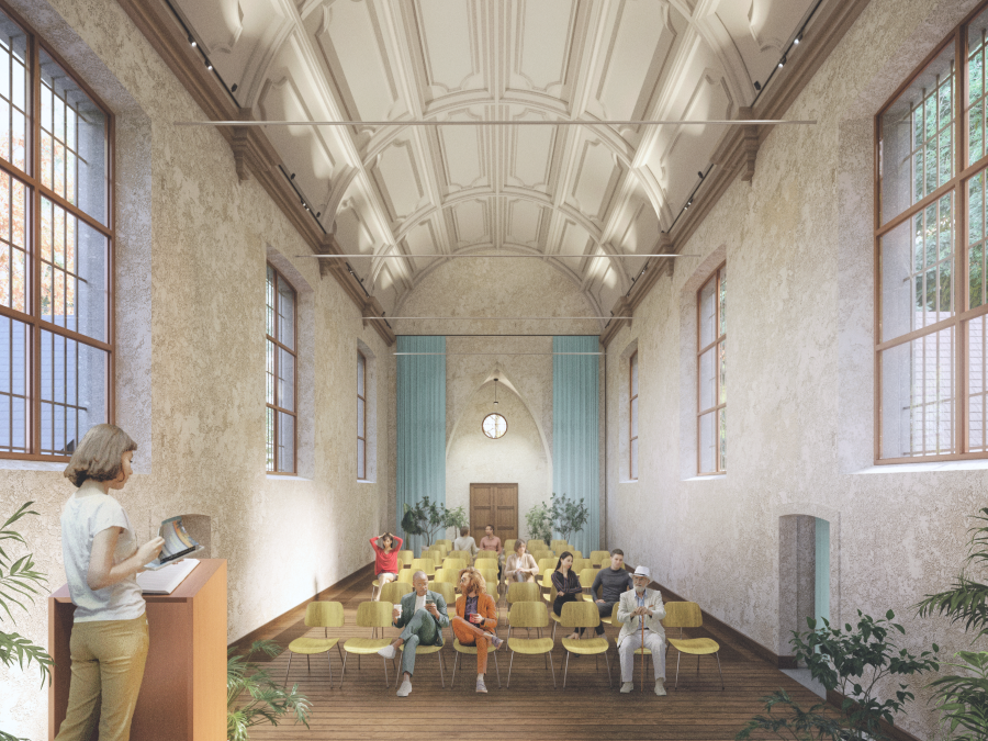 Voor deze tijdelijke herbestemming zijn zowel aan het exterieur als binnenin een aantal restauratiewerken vereist opdat aan enkele basisbehoeften kan voldaan worden. In het interieur worden een aantal reversibele interventies voorzien, zoals de integratie van een verhoogde kerkvloer alsook de implementatie van een adequate klimatisatie.