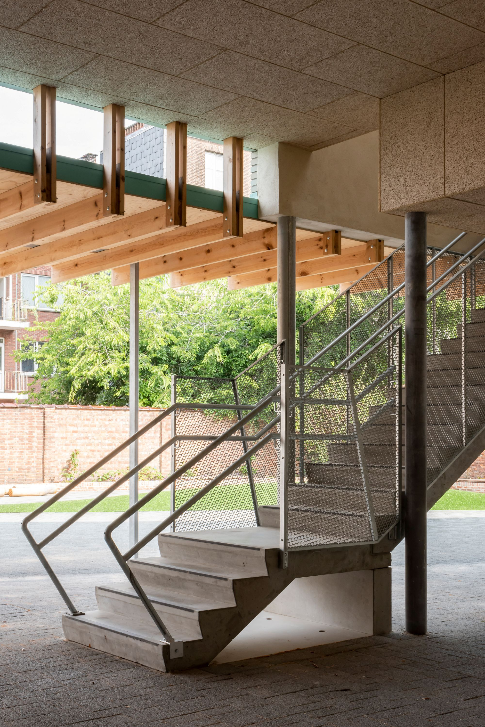 Deze typische vormgeving wordt op een hedendaagse manier geparafraseerd waarbij werd gekozen om de baksteenarchitectuur, de ronde vormen en de uitkragende elementen een plaats te geven in het ontwerp. Er werd zoveel mogelijk licht en lucht gelaten aan de omringende bebouwing. Dit nieuwe schoolgebouw sluit met een lager volume aan op de naastliggende bestaande kleuterschool en wordt hieraan gekoppeld. Met de keuze voor een kopergroene baksteenarchitectuur wordt een link gelinkt naar de koperen koepels van de tegenoverliggende Christus Koningkerk. Het hout van het lage volume sluit aan bij de kleur van de gevelsteen van de kleuterschool en is doorgetrokken in de luifel.