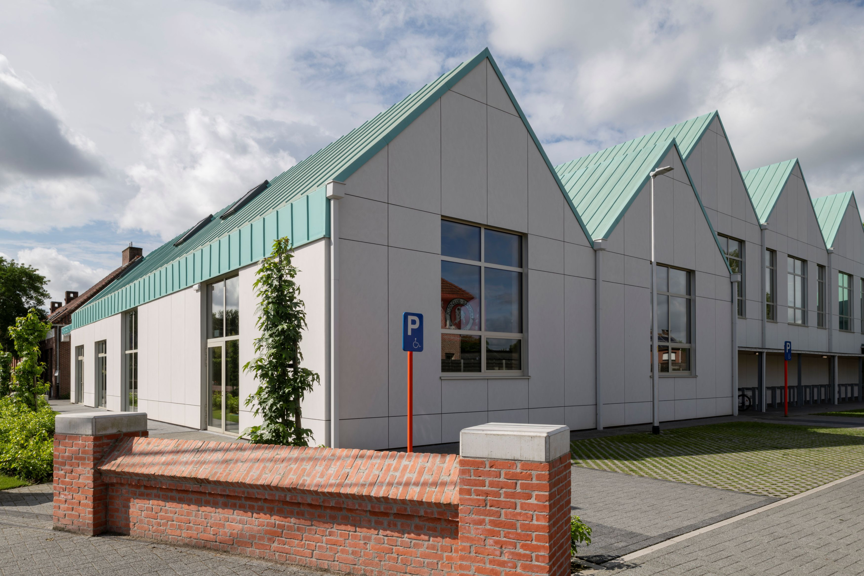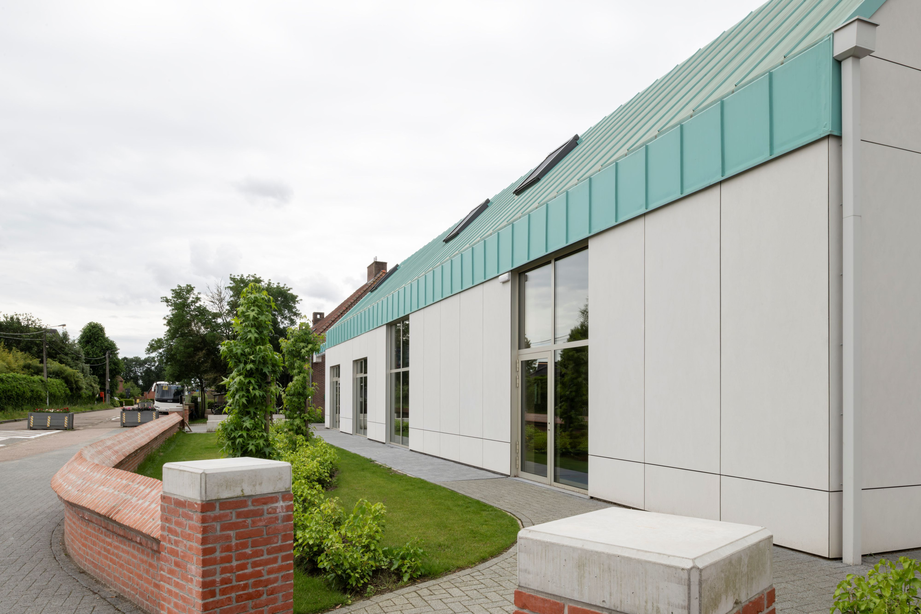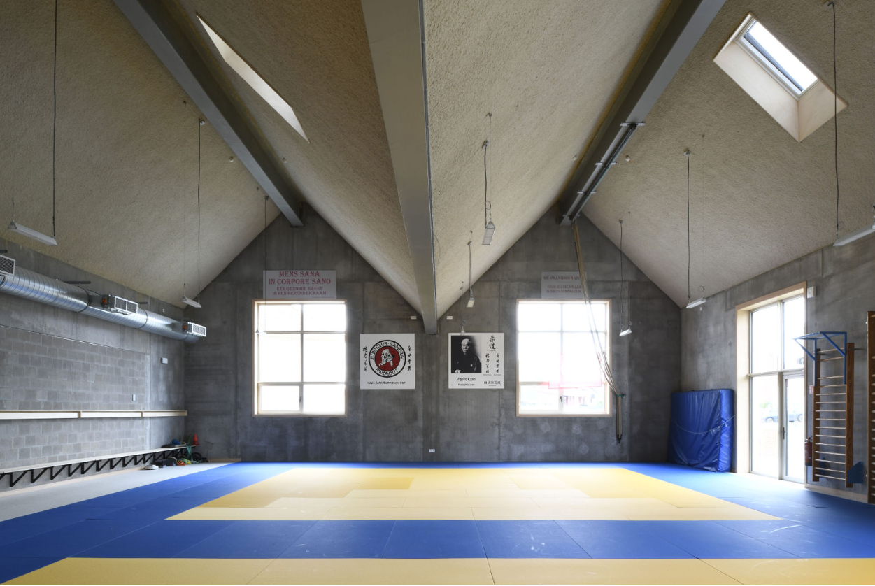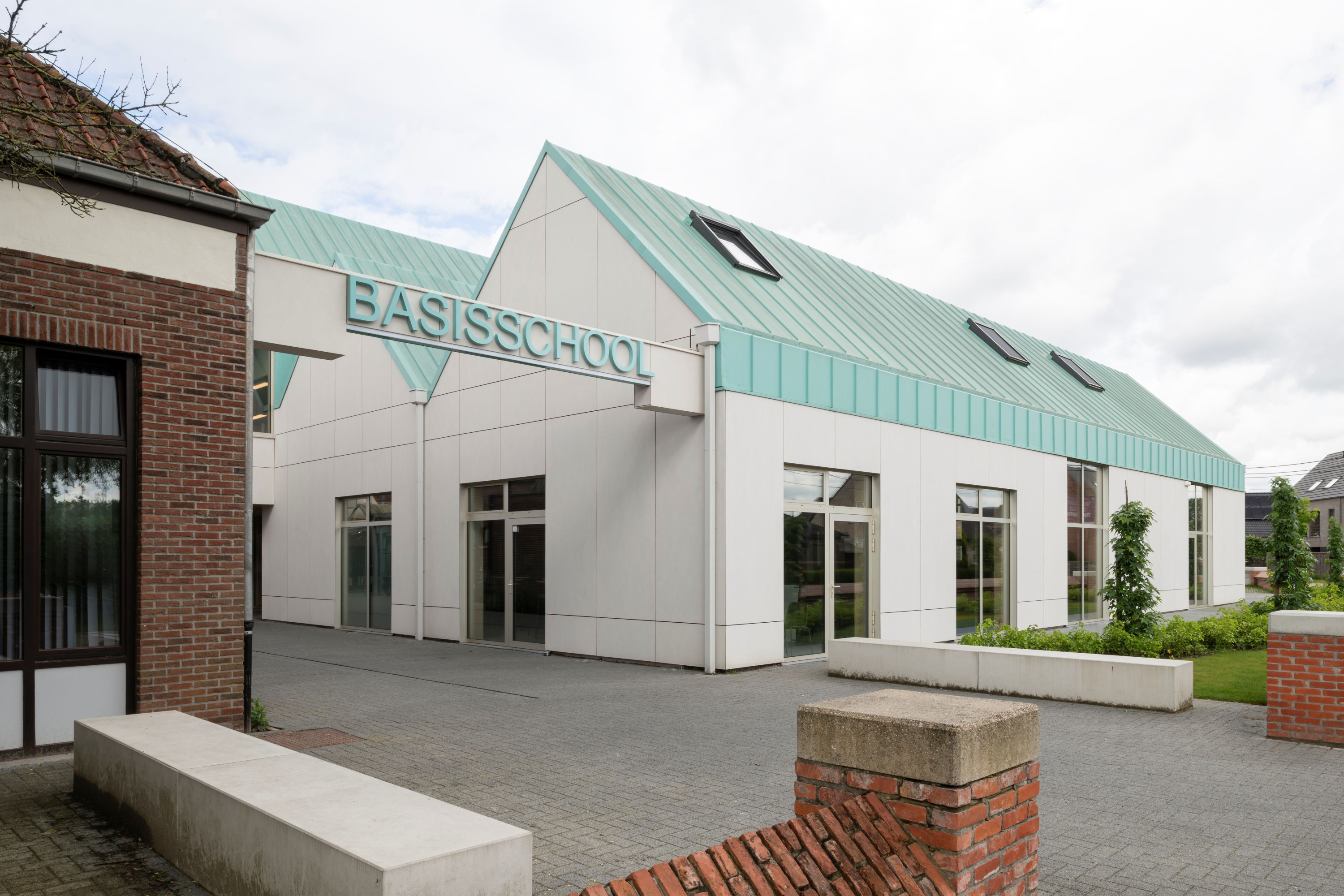 De gemeentelijke basisschool bevindt zich in een landelijke omgeving met een redelijk kleinschalig en versnipperde uitstraling. De school is het enige grotere element in de directe omgeving. Met het nieuwe volume wordt het bouwblok vervolledigd aan de zijde van de Schoolstraat. De bestaande typologie wordt doorgetrokken om een duidelijke gevellijn te creëren. Door het herhalen van nok- en kroonlijsthoogte van het lagere schoolgebouw creëren we rust in een amorf gebied. Het volume wordt herhaald en per twee aan elkaar geschakeld om de verschillende functies te groeperen. Om de judo vereniging als zelfstandige entiteit te bewaren, krijgt deze een plaats aan de straatzijde. De BKO krijgt een plaats achteraan zodat de speelplaats van de kleuterschool als gedeelde buitenruimte kan functioneren. De turnzaal bevindt zich in het midden, in het verlengde van de toegang vanuit de school. De turnzaal kan een dubbel gebruik krijgen en gekoppeld worden aan de BKO of Judozaal. De volumes worden verhoogd of verlaagd in relatie met de functionele invulling. Door de volumes zijdelings te verschuiven ten opzichte van elkaar, kunnen leesbare toegangen gecreëerd worden.