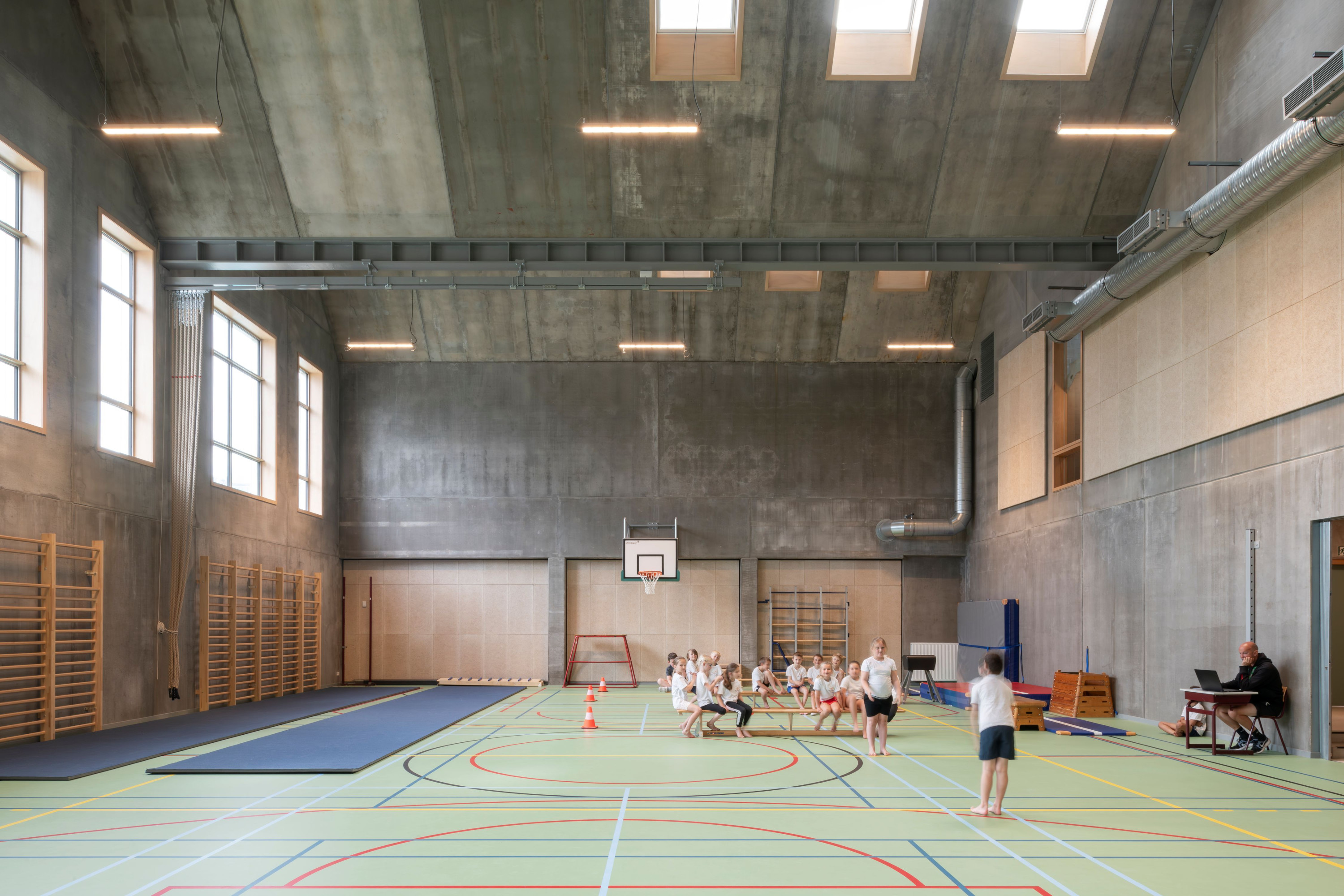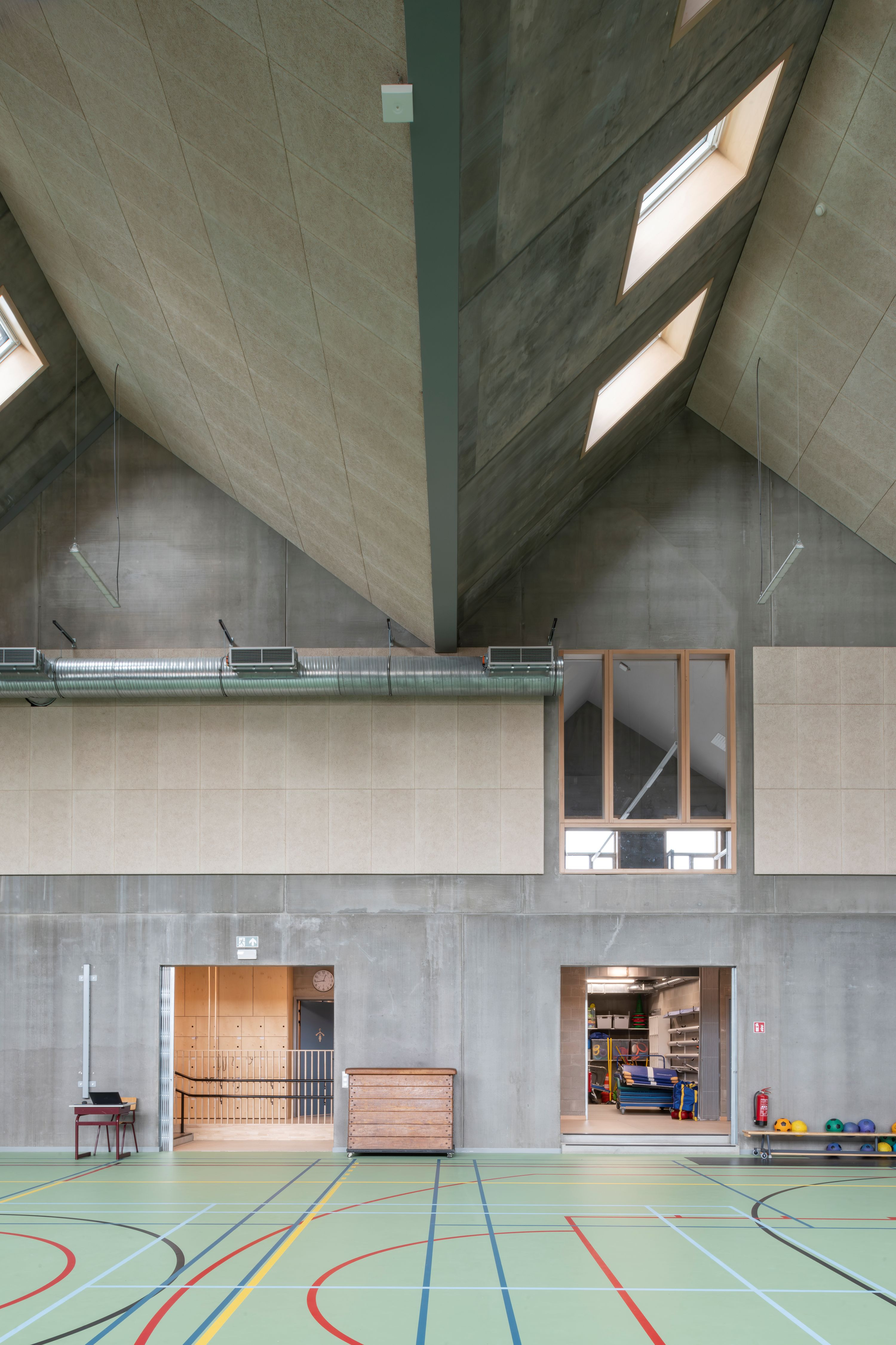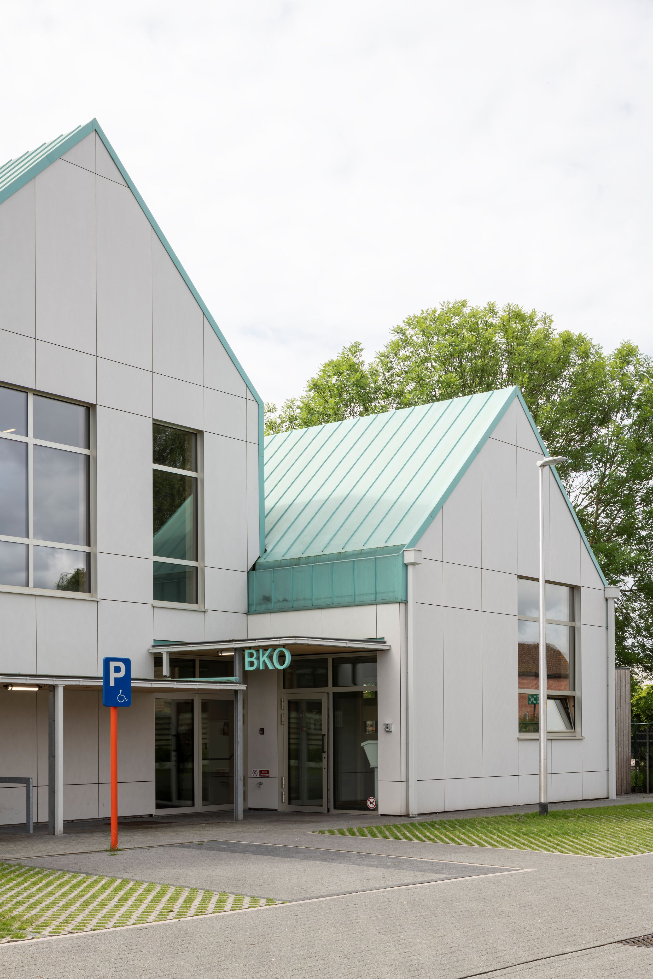 De gemeentelijke basisschool bevindt zich in een landelijke omgeving met een redelijk kleinschalig en versnipperde uitstraling. De school is het enige grotere element in de directe omgeving. Met het nieuwe volume wordt het bouwblok vervolledigd aan de zijde van de Schoolstraat. De bestaande typologie wordt doorgetrokken om een duidelijke gevellijn te creëren. Door het herhalen van nok- en kroonlijsthoogte van het lagere schoolgebouw creëren we rust in een amorf gebied. Het volume wordt herhaald en per twee aan elkaar geschakeld om de verschillende functies te groeperen. Om de judo vereniging als zelfstandige entiteit te bewaren, krijgt deze een plaats aan de straatzijde. De BKO krijgt een plaats achteraan zodat de speelplaats van de kleuterschool als gedeelde buitenruimte kan functioneren. De turnzaal bevindt zich in het midden, in het verlengde van de toegang vanuit de school. De turnzaal kan een dubbel gebruik krijgen en gekoppeld worden aan de BKO of Judozaal. De volumes worden verhoogd of verlaagd in relatie met de functionele invulling. Door de volumes zijdelings te verschuiven ten opzichte van elkaar, kunnen leesbare toegangen gecreëerd worden.