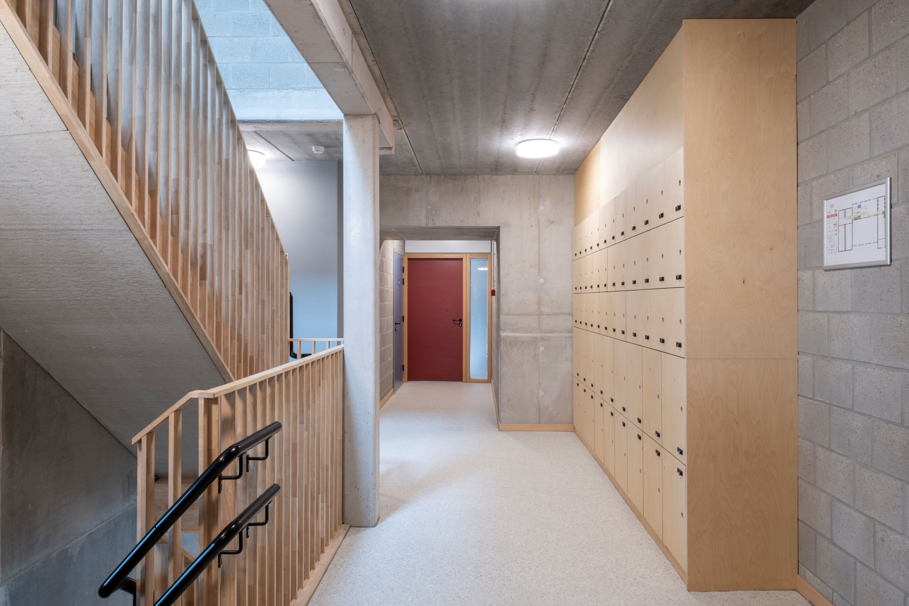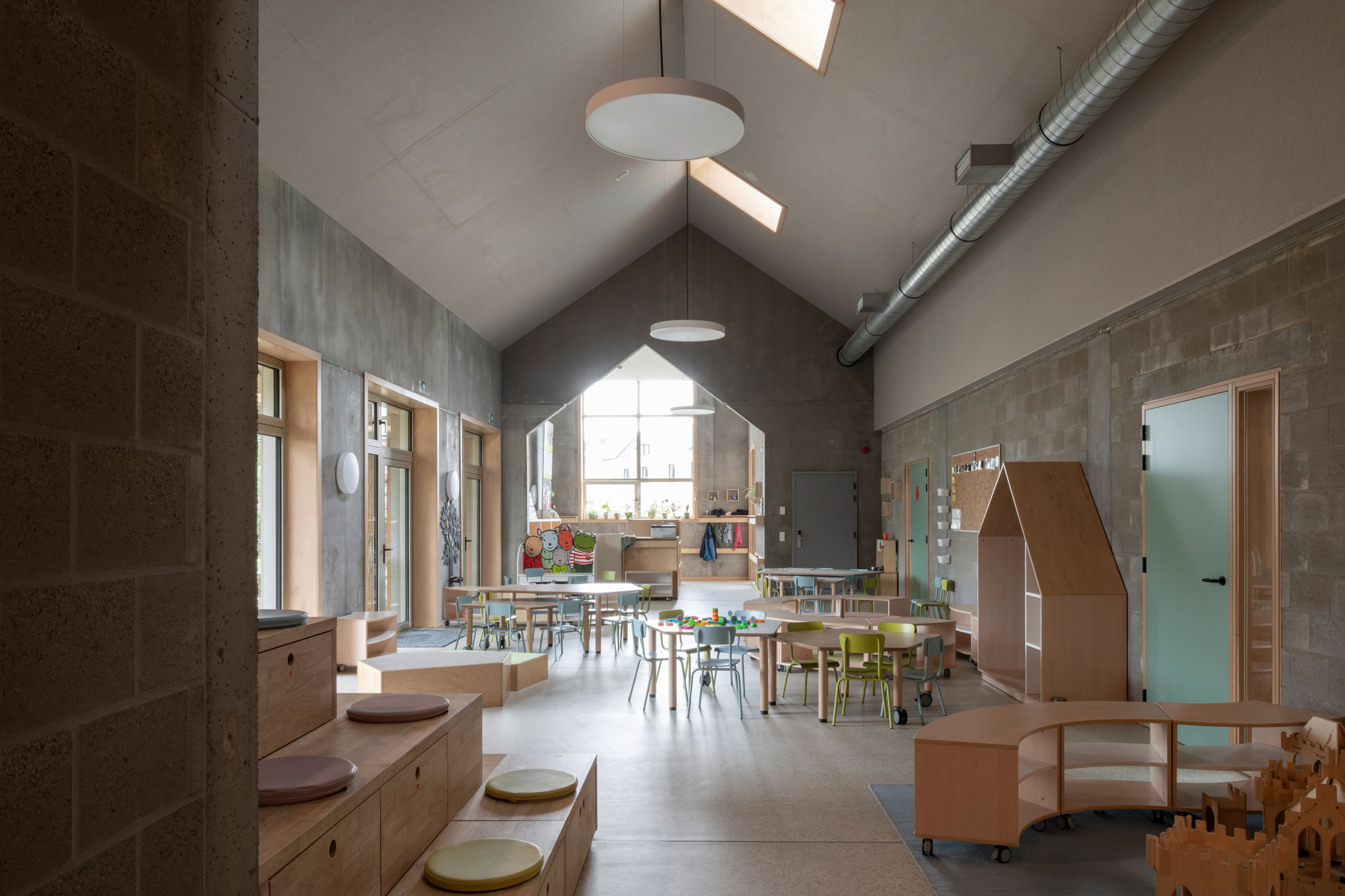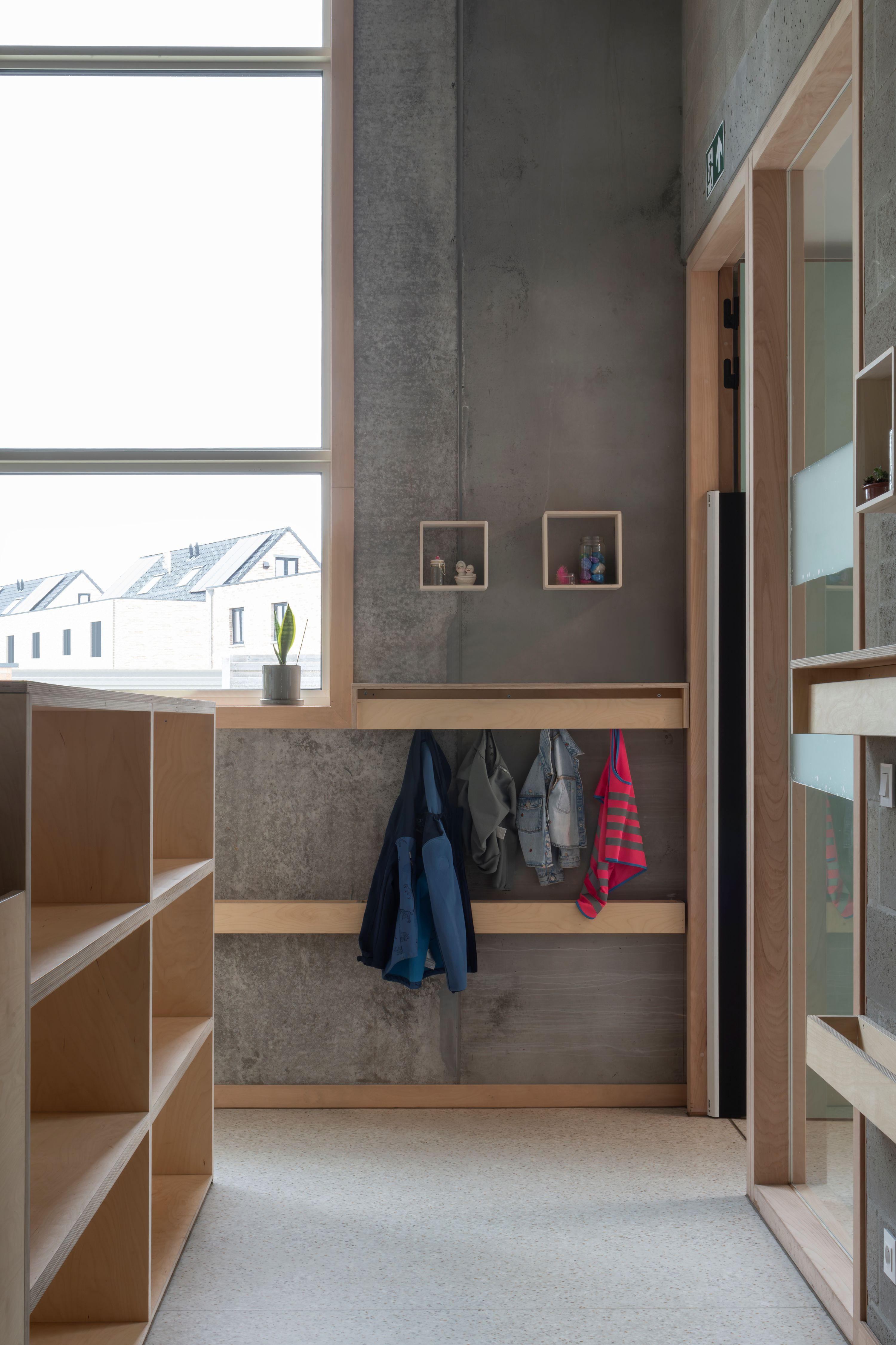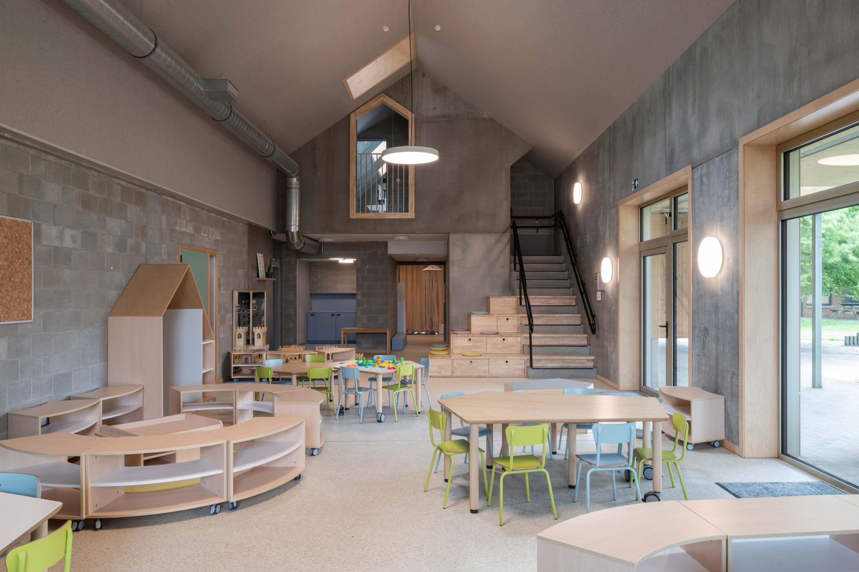 De gemeentelijke basisschool bevindt zich in een landelijke omgeving met een redelijk kleinschalig en versnipperde uitstraling. De school is het enige grotere element in de directe omgeving. Met het nieuwe volume wordt het bouwblok vervolledigd aan de zijde van de Schoolstraat. De bestaande typologie wordt doorgetrokken om een duidelijke gevellijn te creëren. Door het herhalen van nok- en kroonlijsthoogte van het lagere schoolgebouw creëren we rust in een amorf gebied. Het volume wordt herhaald en per twee aan elkaar geschakeld om de verschillende functies te groeperen. Om de judo vereniging als zelfstandige entiteit te bewaren, krijgt deze een plaats aan de straatzijde. De BKO krijgt een plaats achteraan zodat de speelplaats van de kleuterschool als gedeelde buitenruimte kan functioneren. De turnzaal bevindt zich in het midden, in het verlengde van de toegang vanuit de school. De turnzaal kan een dubbel gebruik krijgen en gekoppeld worden aan de BKO of Judozaal. De volumes worden verhoogd of verlaagd in relatie met de functionele invulling. Door de volumes zijdelings te verschuiven ten opzichte van elkaar, kunnen leesbare toegangen gecreëerd worden.