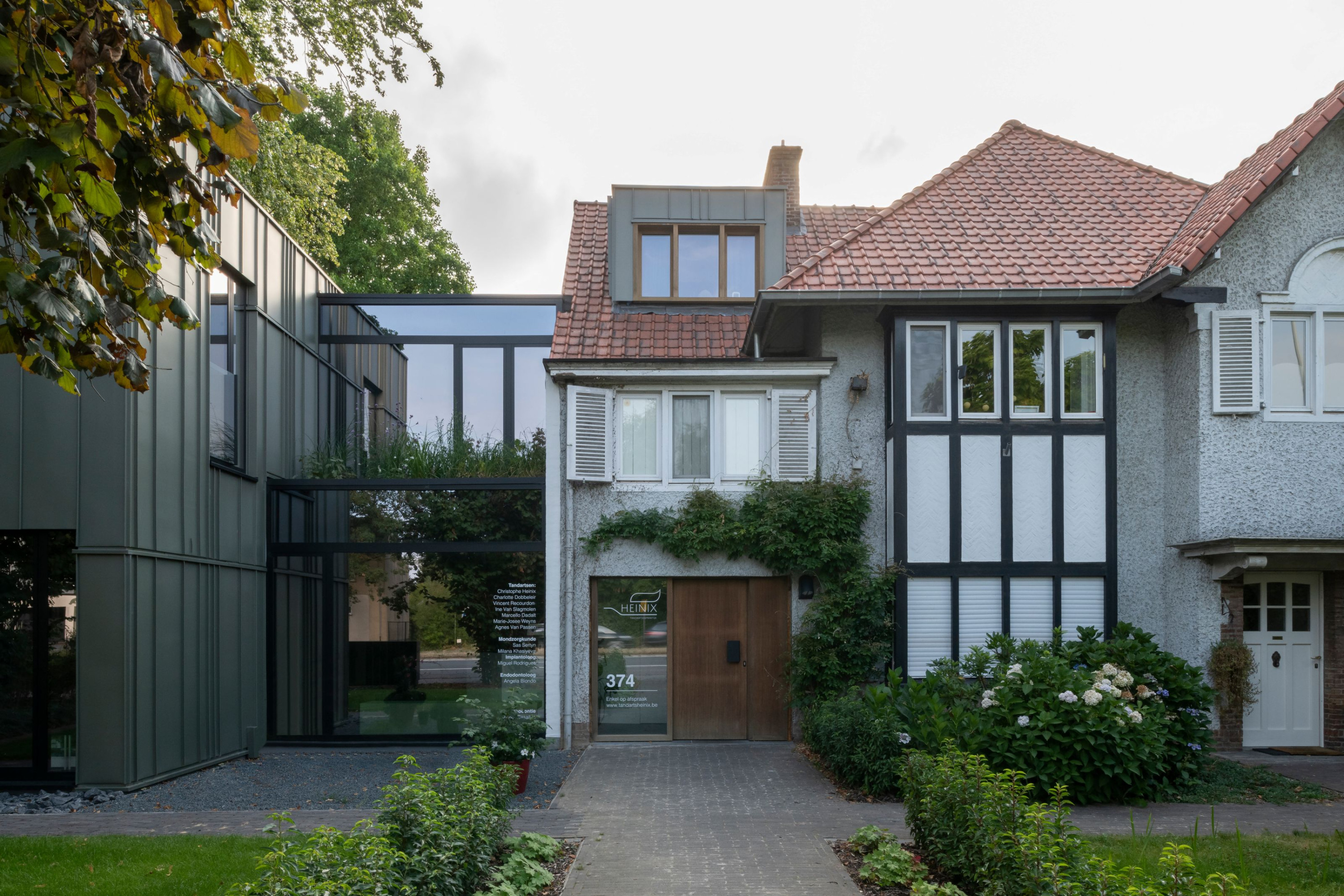 Hoewel de architectuur van deze nieuwe tandartspraktijk zich op een bewust hedendaagse manier manifesteert ten opzichte van de aanpalende woning in cottagestijl, vormen beide bouwvolumes een evenwichtige twee-eenheid. Aan de voorgevel krijgen we een volumetrische loskoppeling door middel van een glaspartij en een terugspringend groen dak, terwijl aan de achtergevel een deel van de nieuwbouw doordringt in de bestaande woning. Voor de gevels werd bewust gekozen voor een groene materialisatie, zodat deze architectuur naadloos aansluit met het achterliggend parkdeel.